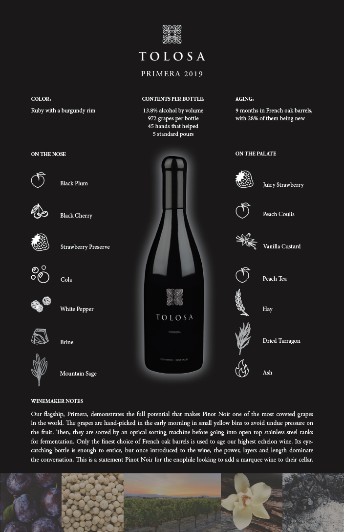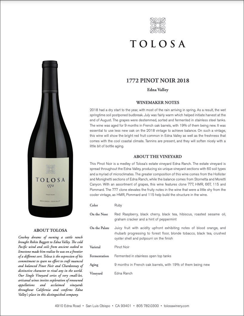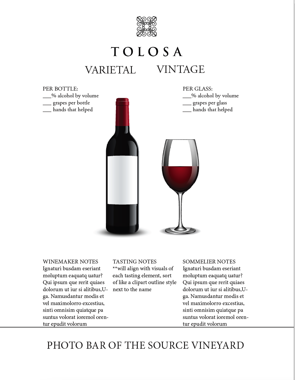 Starting in the fall of 2021, I began the early stages of redesigning Tolosa Winery’s Tech Sheets and making them more visually appealing and accessible to the general public. A tech sheet is an info sheet about a particular type (varietal) of wine is produced each year (vintage). These sheets detail everything from nose and palate notes that a consumer can detect when experiencing the wine, the vineyard that the grapes were sourced from, and winemaker notes about that particular vintage and varietal. In total, there are 14 tech sheets covering two different tiers that are offered at the winery.
